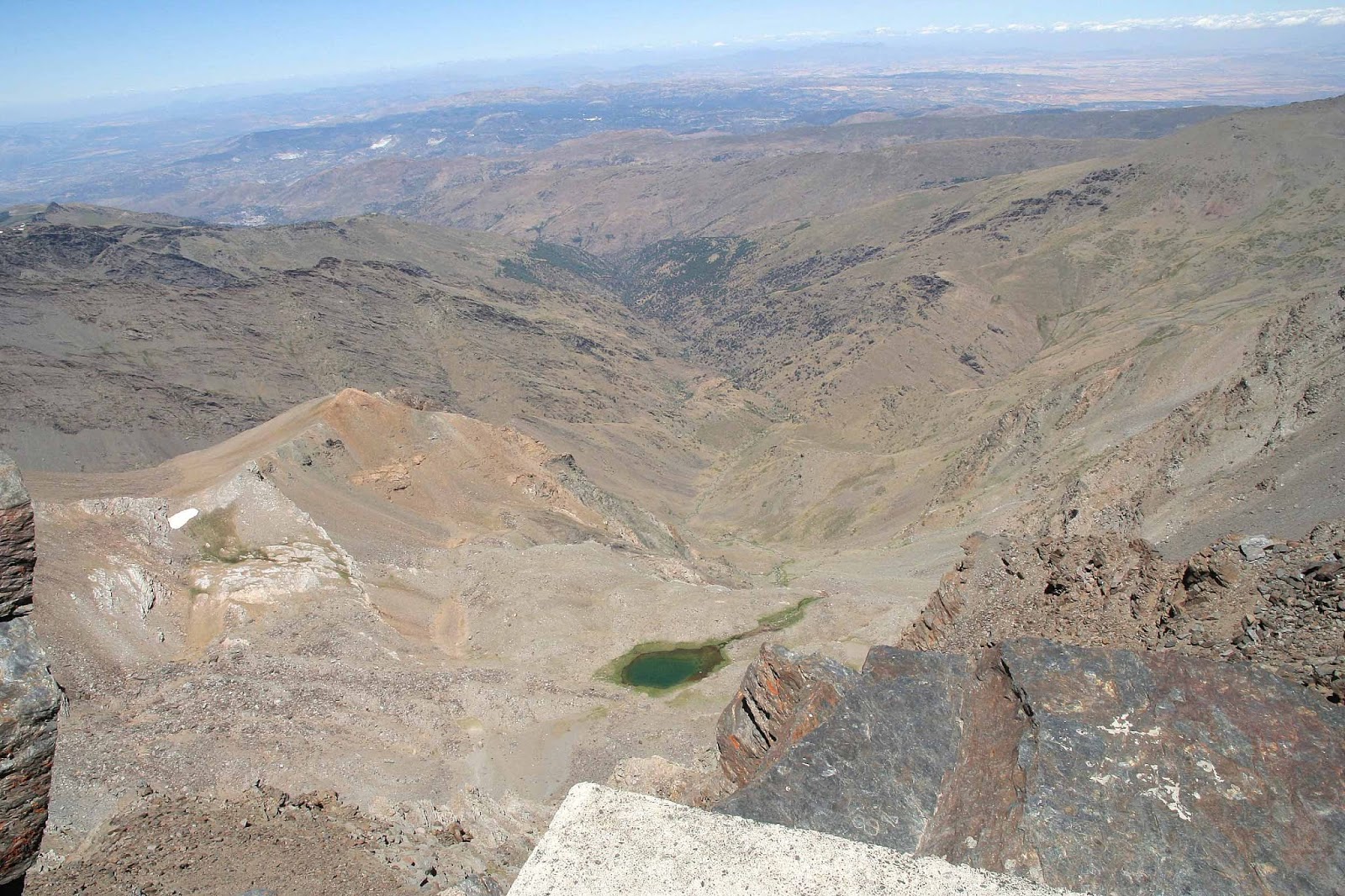Hacia el norte vemos el fuerte desnivel que hay, con la Laguna de la Mosca a los pies de la cara norte del Mulhacén.