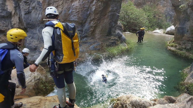 Tras descender el tobogán, desde la misma poza es posible remontar la ladera para poder realizar este espectacular salto de unos 10 mts, Javi y Juan se animan a saltar.