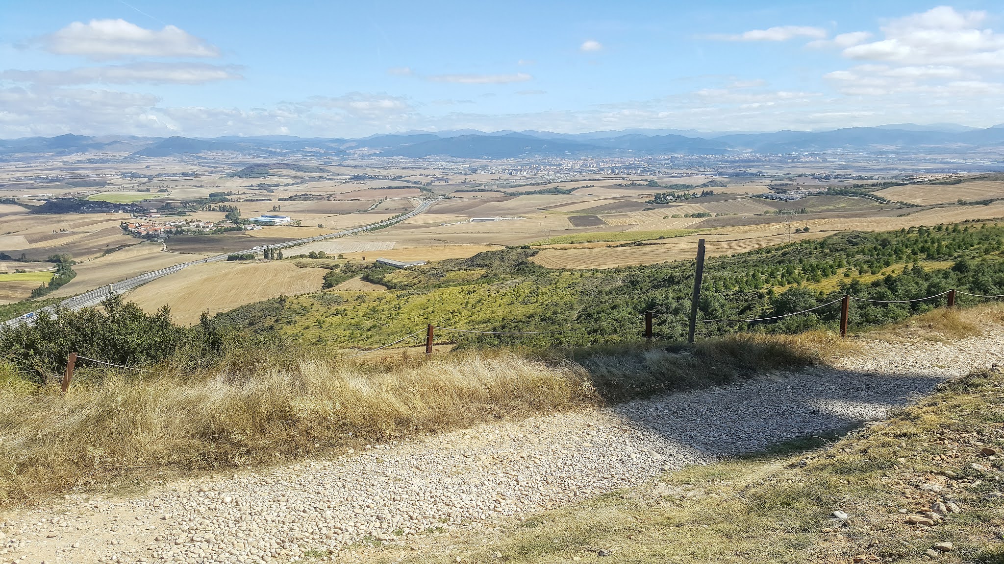 ... que nos llevan hasta las afueras de la ciudad. En la imagen, al frente, ya vemos la Sierra del Perdón que tenemos que superar por el conocido Alto del Perdón, hacia el que nos dirigimos.