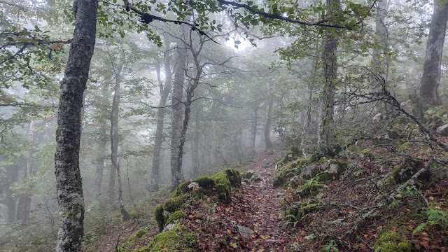 ... ahora el sendero gira a la derecha al Este, y continua entre el bonito hayedo hoy cubierto por la niebla ...