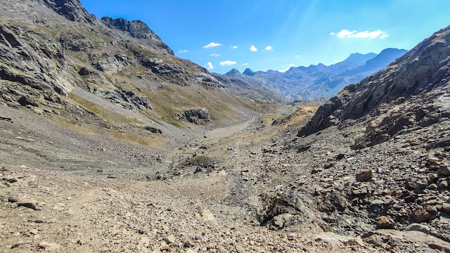 ... desde el Cuello del Infierno, ahora vamos a continuar descendiendo por el Barranco de Piedrafita en dirección al lago de Bachimaña Superior que podemos ver abajo, además, al fondo destaca la poderosa silueta de los picos del macizo del Vignemale, ...